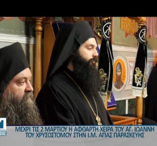 Την άφθαρτη χείρα του Αγίου Ιωάννη του Χρυσοστόμου από την Μονή Βαρλαάμ Μετεώρων υποδέχτηκε χθες, στα προπύλαια της Ανδρώας Μονής Αγίας Παρασκευής Σε…