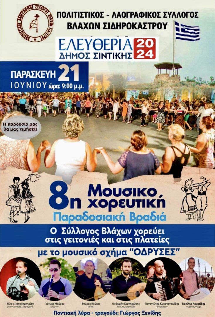 Σας περιμένουμε όλους την Παρασκευή 21/6/2024 και ώρα 9:00 το βράδυ στο Σιδηρόκαστρο στην κεντρική πλατεία για ένα πλούσιο μουσικοχορευτικό, υπέροχο γλέντι…!