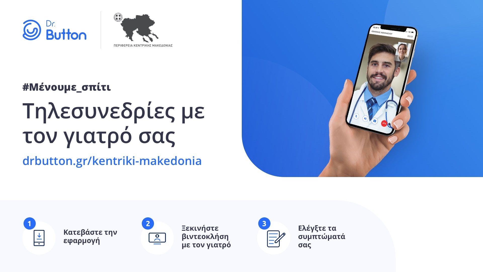 Νέα υπηρεσία τηλεϊατρικής για τους πολίτες που αντιμετωπίζουν ιατρικά ζητήματα και λόγω της πανδημίας κορονοϊού είναι αναγκασμένοι να παραμείνουν στο σπίτι τους, εγκαινίασε σήμερα η Περιφέρεια Κεντρικής Μακεδονίας, σε συνεργασία με τον Ιατρικό Σύλλογο Θεσσαλονίκης και την εταιρία DrButton.