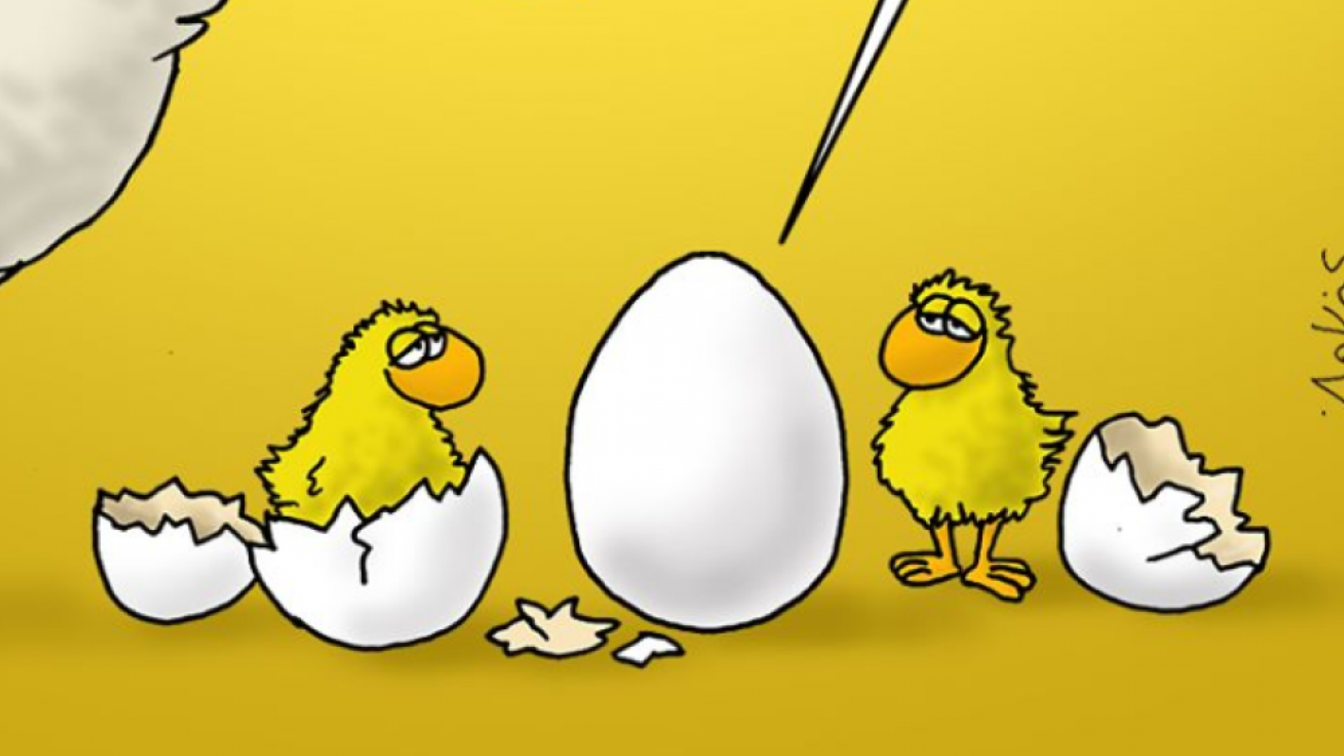 Πρωταγωνιστές στο σκίτσο δύο μωρά κοτοπουλάκια που βγήκαν από το αυγό τους και ένα που φωνάζει από μέσα «Μένουμε Σπίτι».