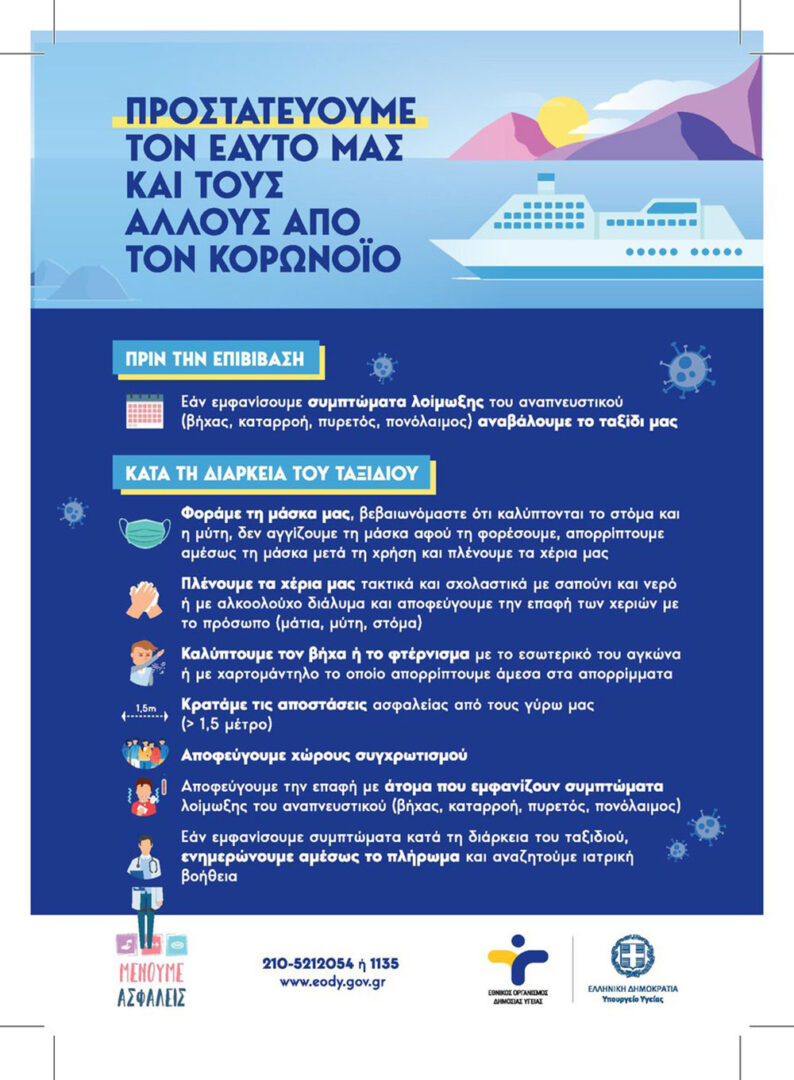Σημειώνεται ότι στα πλοία εφαρμόζεται νέο πρωτόκολλο επιβατών όπου το κάθε πλοίο μπορεί να φιλοξενεί μόνο το 50% των επιβατών, εκτός αν πρόκειται για πλοίο με καμπίνες που το ποσοστό αυτό γίνεται 55%.
