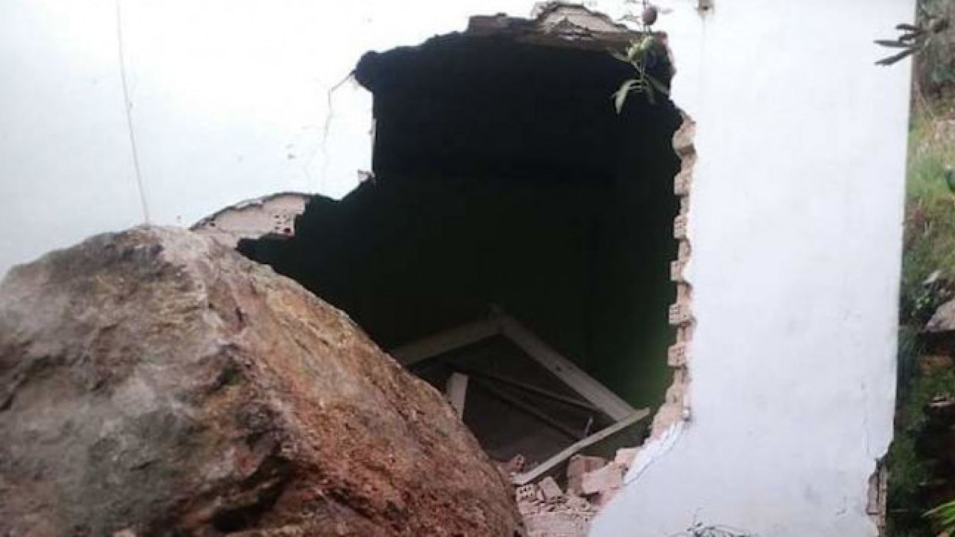 Ο βράχος χτύπησε με δύναμη τον τοίχο του σπιτιού, την ώρα που μέσα βρίσκονταν μια γυναίκα με τον γιο της, ευτυχώς από την αντίθετη πλευρά, στην κουζίνα. Ο τοίχος κατέρρευσε και προκλήθηκαν ζημίες στα δωμάτια.