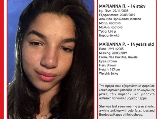 10 Σεπτεμβρίου, 2019 Press Room ΚΟΙΝΩΝΙΑ Αγωνία για την 14χρονη Μαριάννα από την Καβάλα – Συνεχίζει να αγνοείται