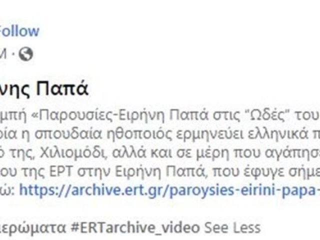 6 Μαΐου, 2020 Press Room ΚΟΙΝΩΝΙΑ Η ΕΡΤ ζήτησε συγγνώμη γιατί «πέθανε» τον Μίκη Θεοδωράκη και την Ειρήνη Παππά