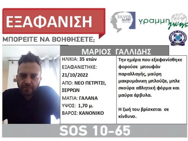 23 Οκτωβρίου, 2022 Press Room NEA, ΣΕΡΡΑΙΚΑ ΝΕΑ, ΣΙΝΤΙΚΗ Εξαφανίστηκε ο 35χρονος Μάριος Γαλλίδης από το Νέο Πετρίτσι