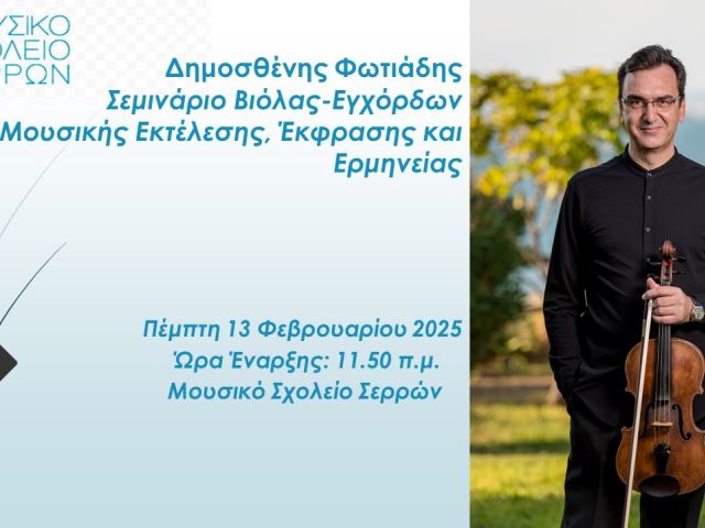 10 Φεβρουαρίου, 2025 Press Room ΣΕΡΡΑΙΚΑ ΝΕΑ, ΣΕΡΡΕΣ Το Μουσικό Σχολείο Σερρών φιλοξενεί, διοργανώνει, συντονίζει και παρουσιάζει το Ειδικό Επιμορφωτικό Σεμινάριο Βιόλας-Εγχόρδων με τον διακεκριμένο Μουσικό, Παιδαγωγό και Μαέστρο της Κρατικής Ορχήστρας Θεσσαλονίκης Δημοσθένη Φωτιάδη,