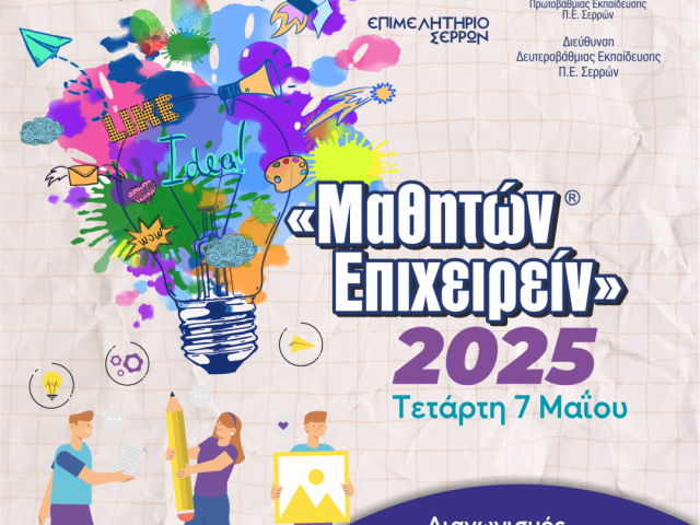 10 Φεβρουαρίου, 2025 Press Room ΣΕΡΡΑΙΚΑ ΝΕΑ Το Επιμελητήριο Σερρών διοργανώνει για ακόμη μία χρονιά φέτος την εκδήλωση-θεσμό, στο επίκεντρο της οποίας βρίσκονται οι μαθητές των Σερρών και οι πρωτότυπες και έξυπνες επιχειρηματικές τους ιδέες.