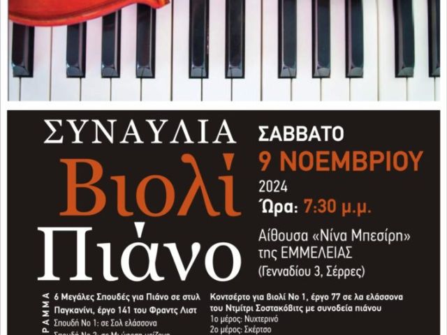 6 Νοεμβρίου, 2024 Press Room NEA, ΠΟΛΙΤΙΣΜΟΣ, ΣΕΡΡΑΙΚΑ ΝΕΑ, ΣΕΡΡΕΣ Μουσική εκδήλωση για Βιολί και Πιάνο με τους Χρύσανθο Γιαννικόπουλο και Σταύρο Λαπαρίδη