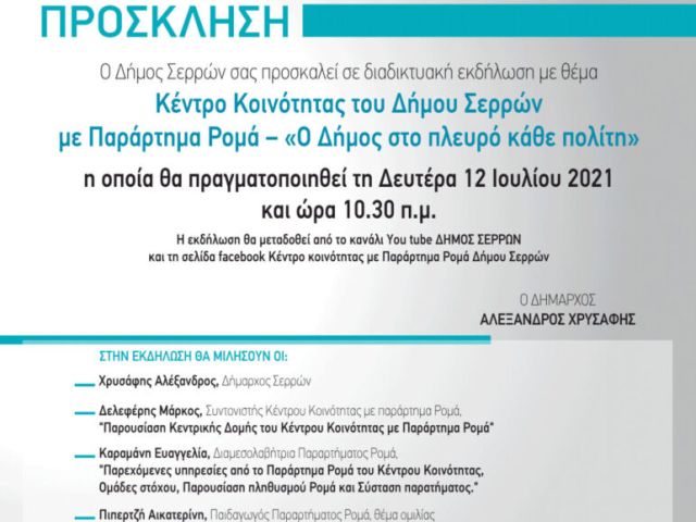 8 Ιουλίου, 2021 Press Room NEA, ΚΟΙΝΩΝΙΑ, ΣΕΡΡΑΙΚΑ ΝΕΑ, ΣΕΡΡΕΣ Διαδικτυακή Εκδήλωση του Δήμου Σερρών για το Κέντρο Κοινότητας με Παράρτημα Ρομά «Ο Δήμος στο πλευρό κάθε πολίτη»