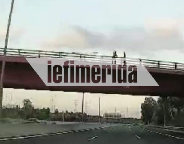 Οι επιβάτες αυτοκινήτου κατέγραψαν δύο άτομα πάνω σε γέφυρα στην εθνική οδό Αθηνών – Κορίνθου ένα χιλιόμετρο περίπου π…