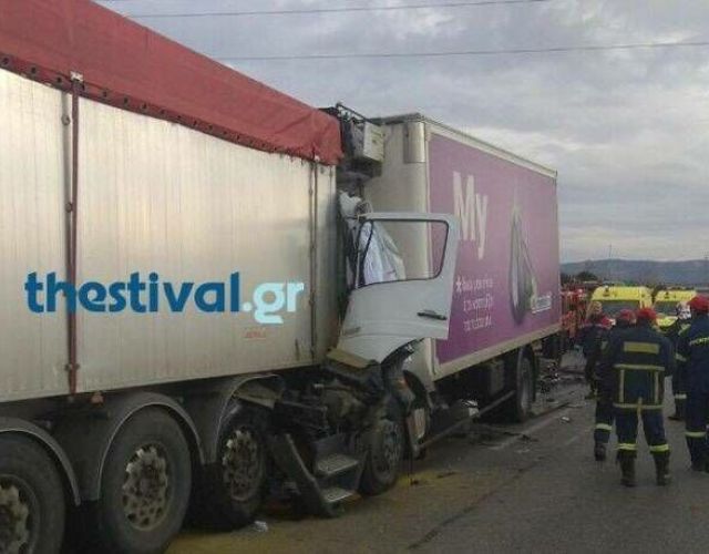 Σφοδρή σύγκρουση φορτηγών στη Θεσσαλονίκη: Εγκλωβίστηκε άντρας – Οι πρώτες εικόνες από το σημείο