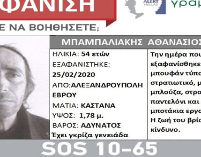 Τα ίχνη του 54χρονου Μπαμπαλιάκη Αθανάσιου χάθηκαν την Τρίτη 25 Φεβρουαρίου 2020 από την Αλεξανδρούπολη. Ο αγνοούμενος…