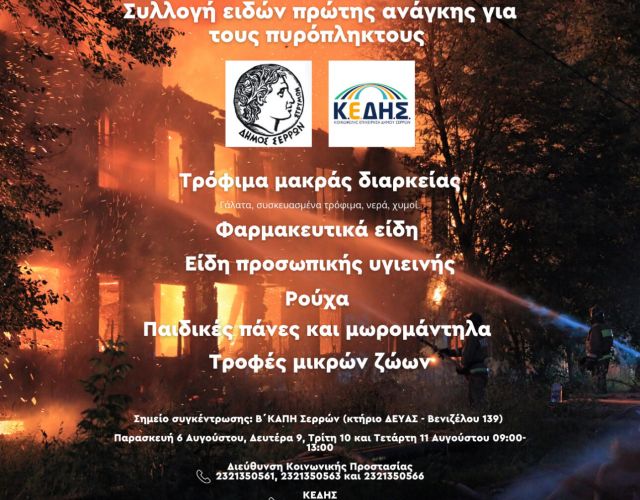 Δήμος Σερρών: Συγκέντρωση ειδών πρώτης ανάγκης για τους πυρόπληκτους