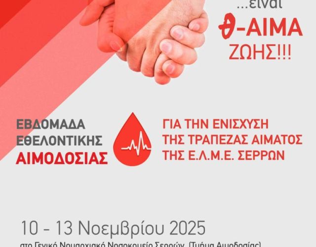 Η Ε.Λ.Μ.Ε. Σερρών διοργανώνει Εθελοντική Αιμοδοσία σε συνεργασία με το τμήμα Αιμοδοσίας του Γενικού Νομαρχιακού Νοσοκομείου Σερρών