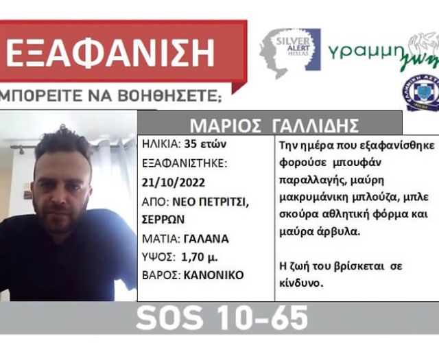 Εξαφανίστηκε ο 35χρονος Μάριος Γαλλίδης από το Νέο Πετρίτσι
