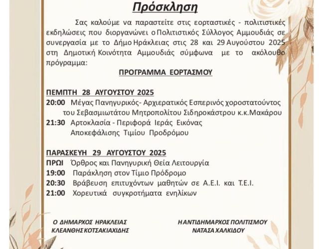 Πρόσκληση για την εορτή του Τιμίου Προδρόμου στη Δημοτική Κοινότητα Αμμουδιάς