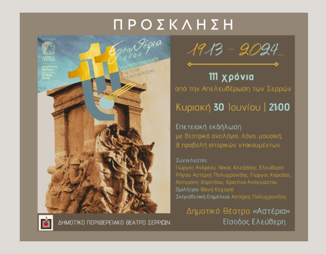 ΔΗ.ΠΕ.ΘΕ. ΣΕΡΡΩΝ – ΕΠΕΤΕΙΑΚΗ ΕΚΔΗΛΩΣΗ “1913- 2024 …111 ΧΡΟΝΙΑ ΑΠΟ ΤΗΝ ΑΠΕΛΕΥΘΕΡΩΣΗ ΤΩΝ ΣΕΡΡΩΝ” ΣΤΟ ΔΗΜΟΤΙΚΟ ΘΕΑΤΡΟ “ΑΣΤΕΡΙΑ”