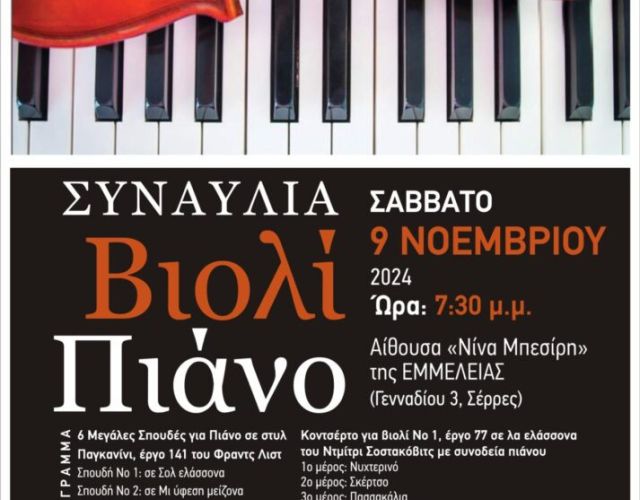 Η Περιφερειακή Ενότητα Σερρών και η Φιλόπτωχος Αδελφότητα Κυριών «Η Εμμέλεια» διοργανώνουν μουσική εκδήλωση για βιολί…