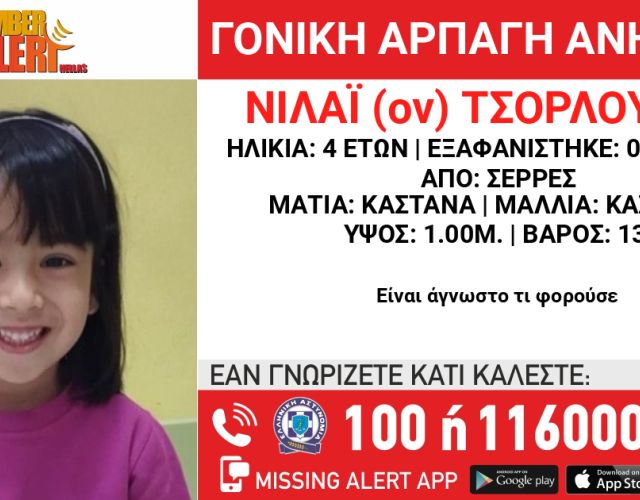AMBER ALERT – ΓΟΝΙΚΗ ΑΡΠΑΓΗ ΤΗΣ (επ.) ΤΣΟΡΛΟΥ (ον.) ΝΙΛΑΪ, 4 EΤΩΝ