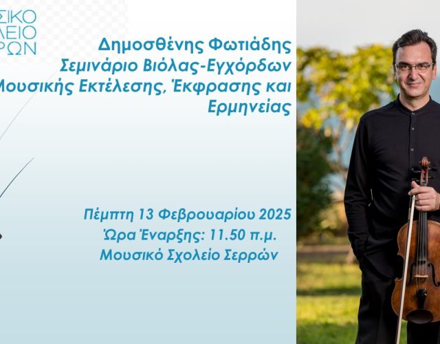 Το Μουσικό Σχολείο Σερρών φιλοξενεί, διοργανώνει, συντονίζει και παρουσιάζει το Ειδικό Επιμορφωτικό Σεμινάριο Βιόλας-Εγχόρδων με τον διακεκριμένο Μουσικό, Παιδαγωγό και Μαέστρο της Κρατικής Ορχήστρας Θεσσαλονίκης Δημοσθένη Φωτιάδη,