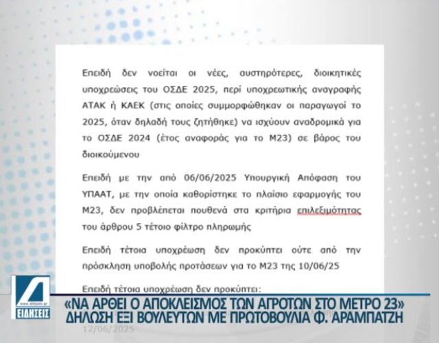 Πρωτοβουλία Φ. Αραμπατζή: Να αρθεί ο αποκλεισμός των αγροτών στο Μ23 ζητούν έξι Βουλευτές της ΝΔ