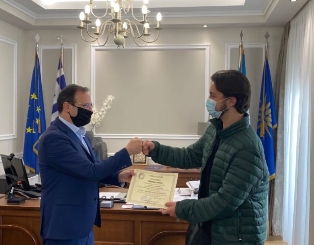 Απονομή υποτροφίας του κληροδοτήματος Ι. Αποστολίδη από τον Δήμαρχο Σερρών στον φοιτητή Σταμάτη Απόστολο