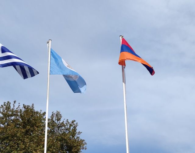 Η τρίχρωμη σημαία της Αρμενίας κυματίζει μαζί με την ελληνική και τη σημαία του Δήμου Σερρών στην πλατεία Ελευθερίας, ό…