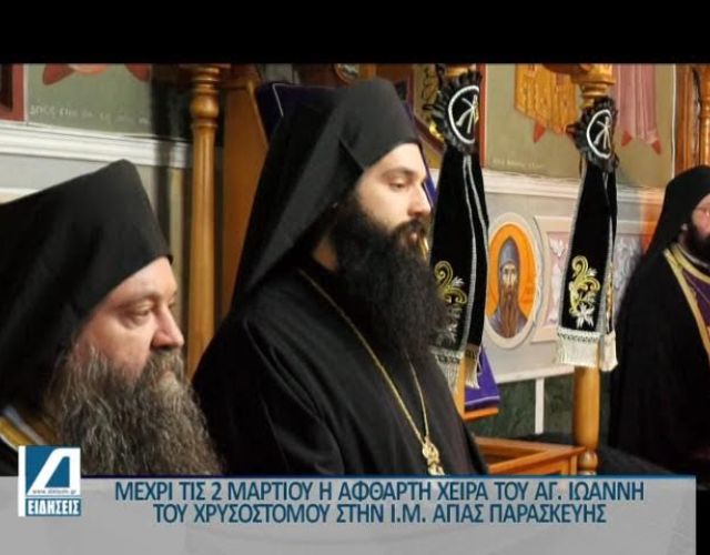Την άφθαρτη χείρα του Αγίου Ιωάννη του Χρυσοστόμου από την Μονή Βαρλαάμ Μετεώρων υποδέχτηκε χθες, στα προπύλαια της Ανδ…