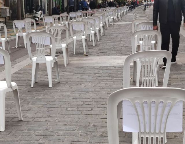 Στήθηκαν τα άδεια καθίσματα στο κέντρο των Σερρών, προκειμένου οι Σερραίοι ιδιοκτήτες καφέ και εστιατορίων να δείξουν τ…