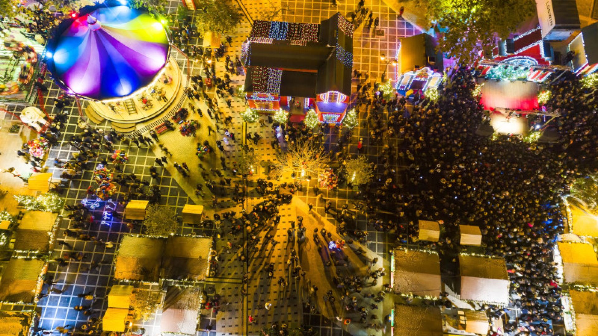Πεζούλια και κολώνες έχουν φωταγωγηθεί, τα σπιτάκια είναι παραμυθένια, σαν σκηνικό θεάτρου, μπαλόνια, παιδιά και οικογένειες απολαμβάνουν το παιχνίδι και το καρουζέλ, κερδίζει τις εντυπώσεις.