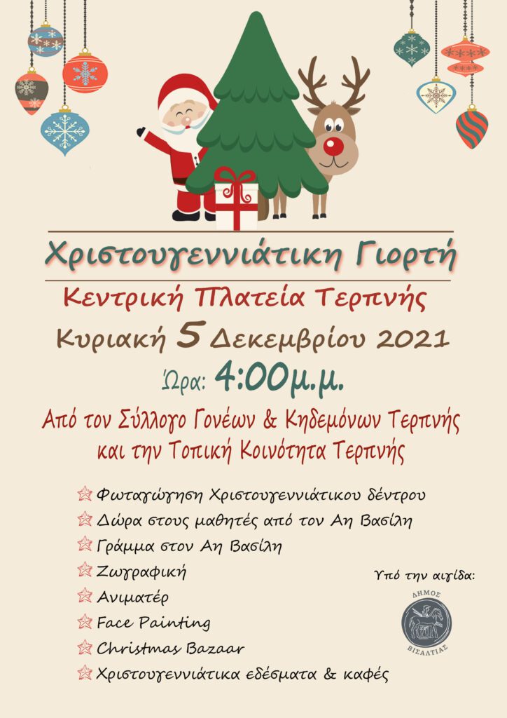 Την Κυριακή 5 Δεκεμβρίου στις 16:00 στην Κεντρική Πλατεία της Τερπνής θα πραγματοποιηθεί η Χριστουγεννιάτικη γιορτή από την Τοπική Κοινότητα της Τερπνής και ο Σύλλογος Γονέων και Κηδεμόνων του δημοτικού Σχολείου. Η διοργάνωση θα γίνει υπό την αιγίδα του Δήμου Βισαλτίας.