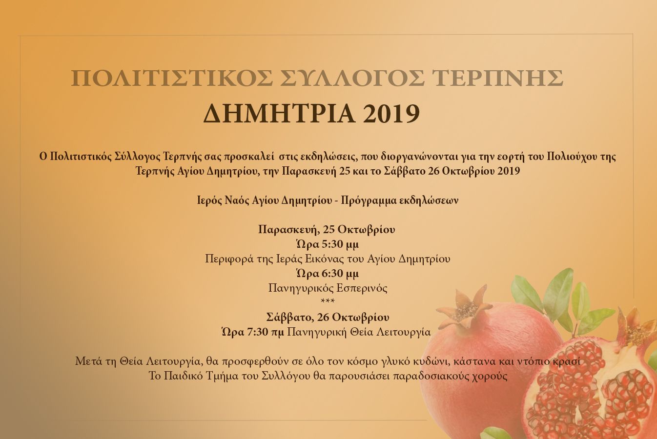 Ο Πολιτιστικός Σύλλογος Τερπνής, στο πλαίσιο του εορτασμού του Ιερού Ναού του Αγίου Δημητρίου Τερπνής, διοργανώνει εκδηλώσεις στον αύλειο χώρο της εκκλησίας, ανήμερα της εορτής.