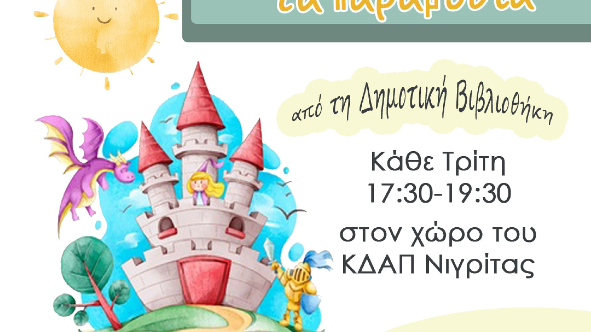 Η αφήγηση των παραμυθιών θα γίνεται από την νηπιαγωγό κα Πηνελόπη Καλαμπαλίκα, κάθε Τρίτη 17:30 – 19:30 στον χώρο του ΚΔΑΠ Νιγρίτας.