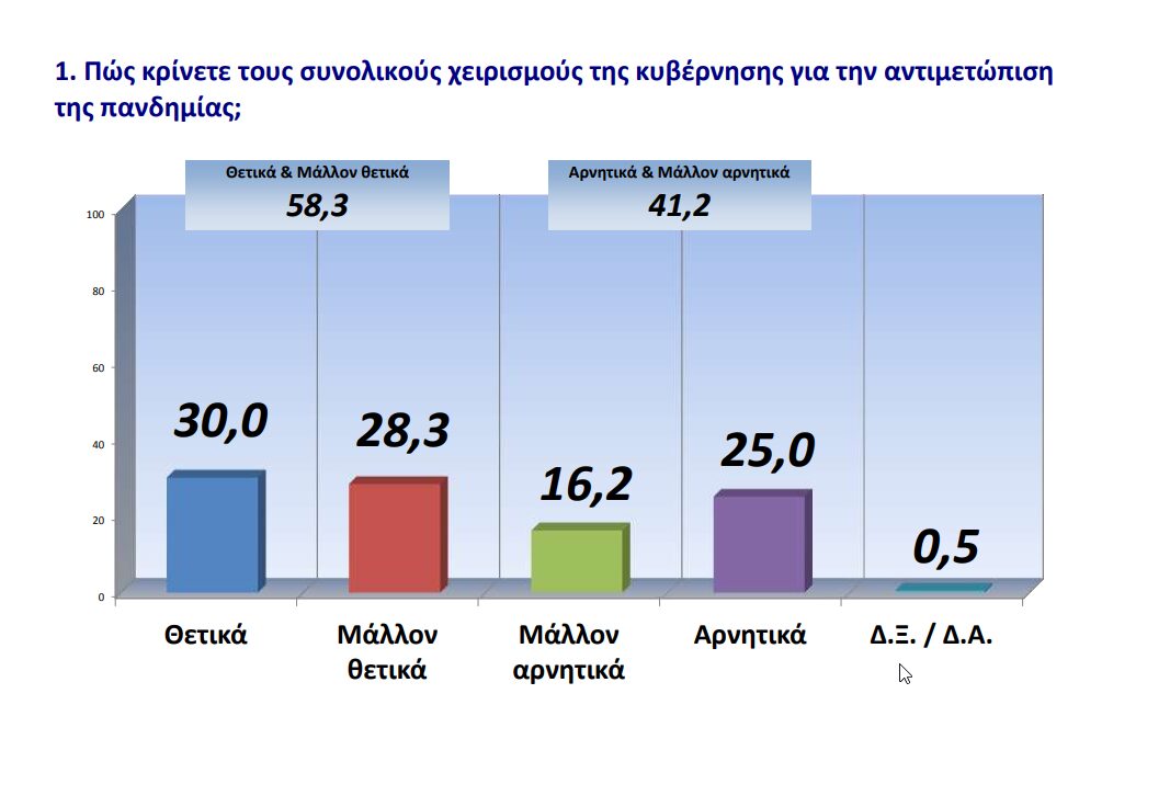 Κρίνουν θετικά τους συνολικούς χειρισμούς της κυβέρνησης για την πανδημία (58,3%) και θεωρούν ότι έλαβε έγκαιρα τα μέτρα (52,9%).