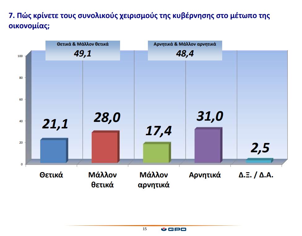 Η δημοσκόπηση της GPO καταγράφει επίσης οριακά θετικό πρόσημο στους χειρισμούς της κυβέρνησης στον χώρο της Οικονομίας (49,1-48,4%).