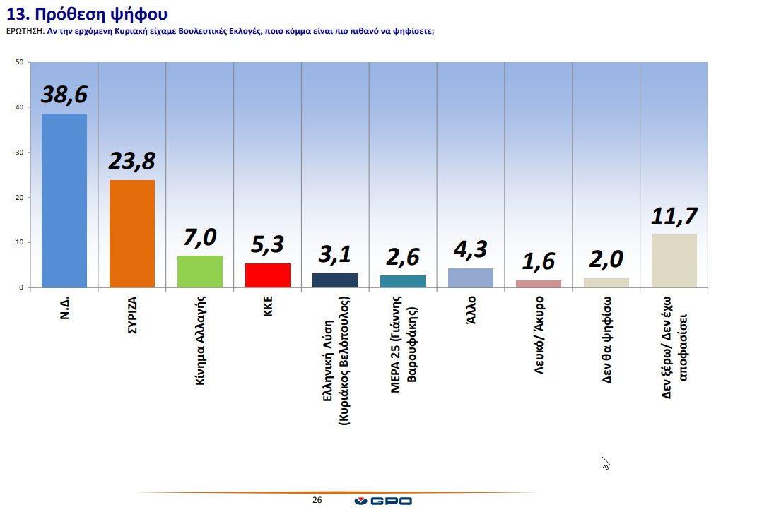 Σύμφωνα με τη μέτρηση της GPO για το Action24, που παρουσιάστηκε στην εκπομπή «Evening Report] του Γιώργου Κουβαρά, στην πρόθεση ψήφου η ΝΔ προηγείται με 38,6%, έναντι 23,8% του ΣΥΡΙΖΑ. Ακολουθούν το ΚΙΝΑΛ με 7%, το ΚΚΕ με 5,3%, η Ελληνική Λύση με 3,1% και το ΜέΡΑ25 με 2,6%.