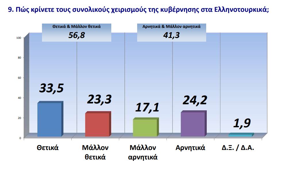 Οι κυβερνητικοί χειρισμοί στα ελληνοτουρκικά κρίνονται θετικά από την πλειοψηφία (56,8%), ενώ διχασμένη εμφανίζεται η κοινή γνώμη ανάμεσα στην αναζήτηση διπλωματικής λύσης ή χρήσης στρατιωτικών μέσων στην περίπτωση που η Τουρκία προχωρήσει σε έρευνες εντός του ορίου των 6 ναυτικών μιλίων (49% έναντι 47,5%).