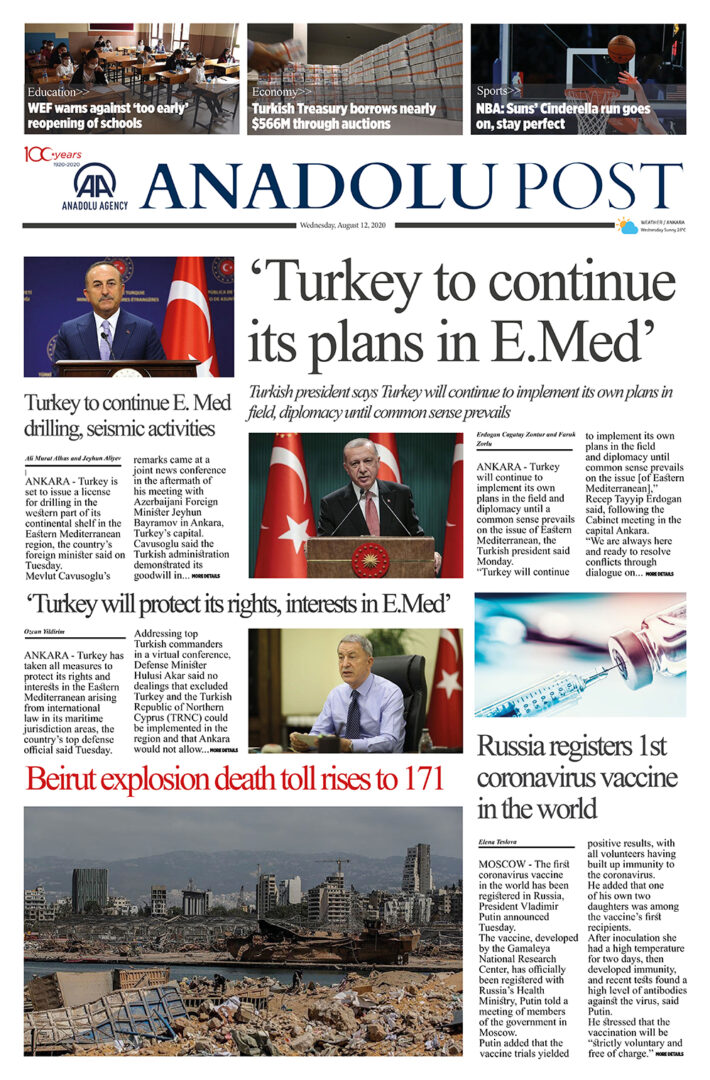 Αντιστοίχως, τα ΜΜΕ κινούνται στο ίδιο κύμα, με το Anadolu στο εξώφυλλό του να έχει τις δηλώσεις Ερντογάν, Ακάρ και Τσαβούσογλου, που λένε ακριβώς το ίδιο πράγμα: ότι η «Τουρκία θα συνεχίσει τα πλάνα της στην ανατολική Μεσόγειο».