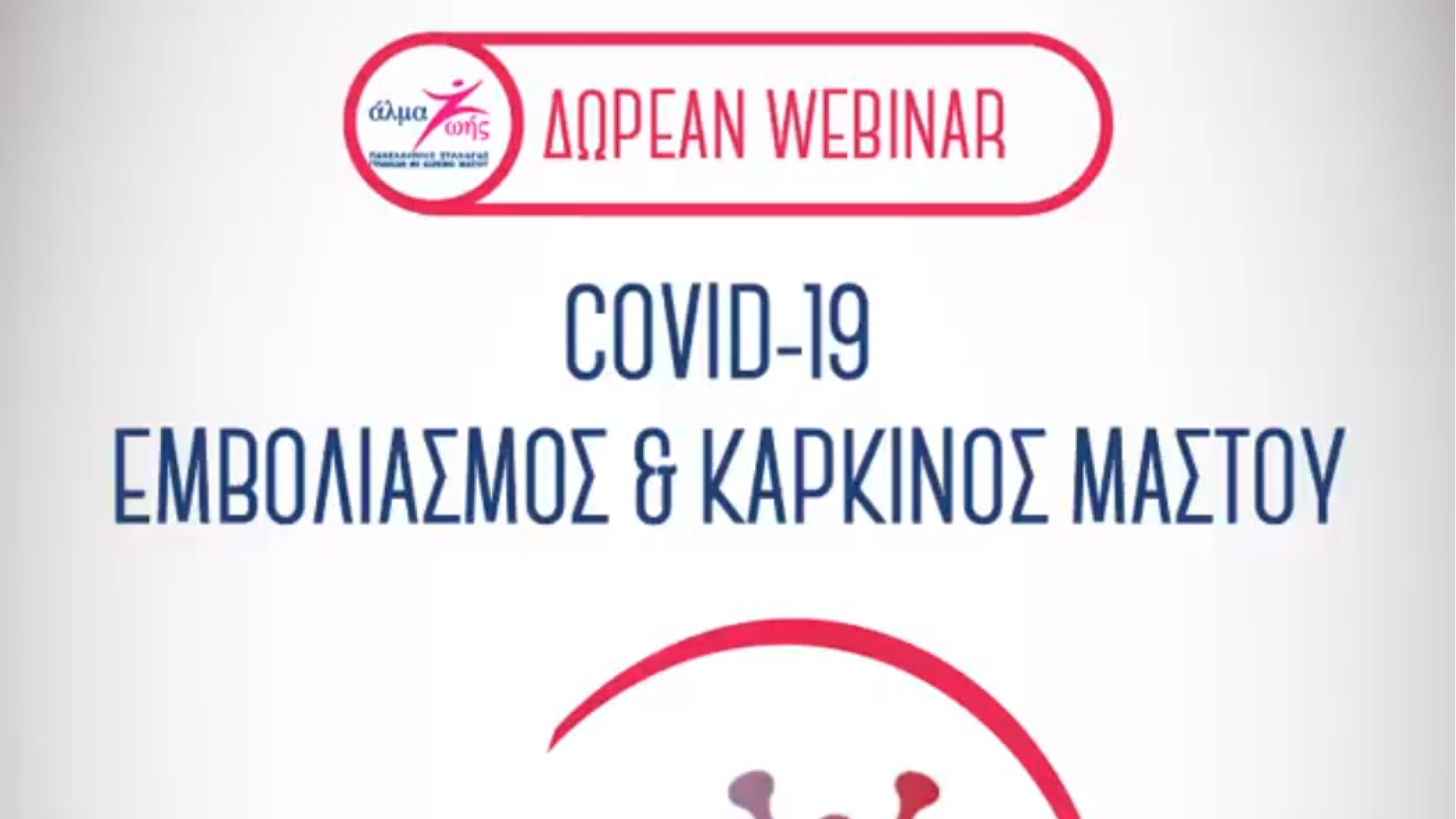 Ο Πανελλήνιος Σύλλογος Γυναικών με Καρκίνο Μαστού «Άλμα Ζωής» διοργανώνει την Παρασκευή 29 Ιανουαρίου 2021, 4μμ – 6μμ, διαδικτυακό ενημερωτικό σεμινάριο (webinar) με θέμα «COVID-19: Εμβολιασμός & Καρκίνος Μαστού».