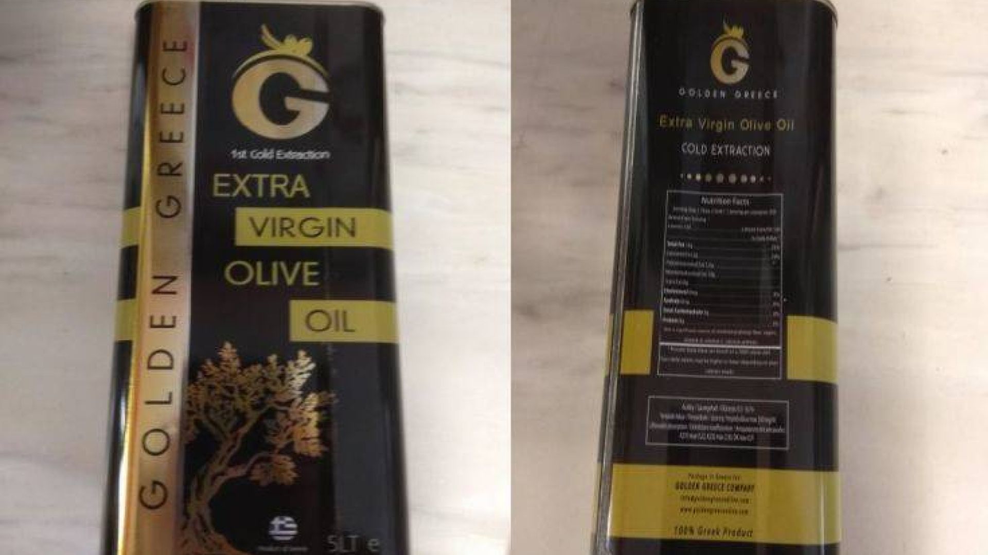 Πρόκειται για το εξαιρετικό παρθένο ελαιόλαδο, με την εμπορική ονομασία «GOLDEN GREECE», σε μεταλλική συσκευασία των 5 λίτρων, το οποίο επί της συσκευασίας αναγράφει ότι είναι 100% ελληνικό προϊόν και δεν αναγράφονται ημερομηνία ανάλωσης και αριθμός παρτίδας, επωλείτο από το κατάστημα Ιονίδης Διονύσιος (Νέο Συρράκο 35 στην Ελευθερούπολη Καβάλας) και αγοράσθηκε από την Golden Greece LTD, (Import-Export, Ul. Han Krum 40 str., 8000 Burgas Bulgaria).