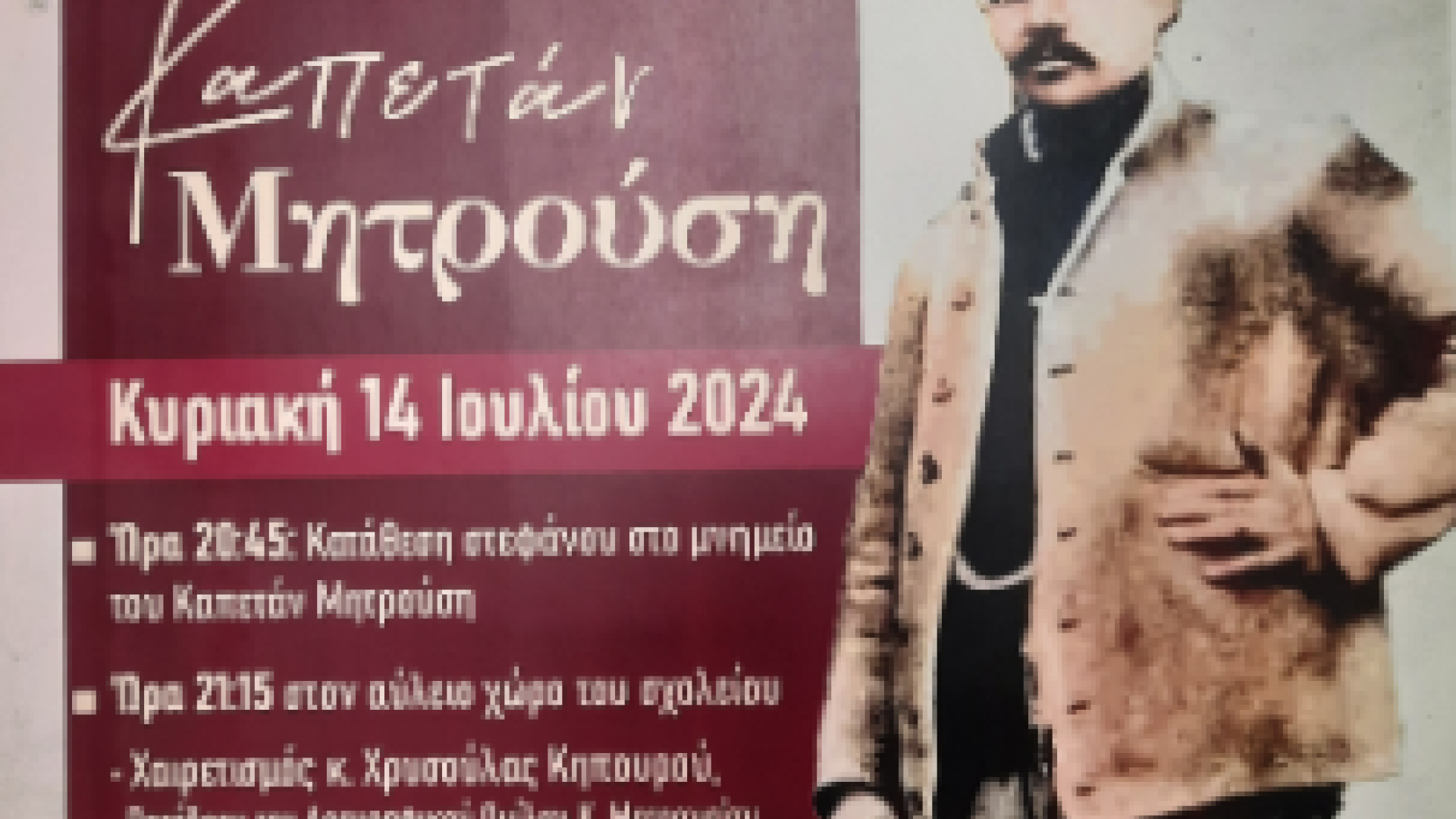 Εκδήλωση τιμής και μνήμης για τον Ήρωα Μακεδονομάχο Καπετάν Μητρούση, διοργανώνει την Κυριακή 14 Ιουλίου 2024 ο Λαογραφικός Όμιλος-Αλληλεγγύης Κ. Μητρουσίου, σε συνεργασία με το Δήμο Σερρών και την Τοπική Κοινότητα Μητρουσίου, στον αύλειο χώρο του σχολείου.