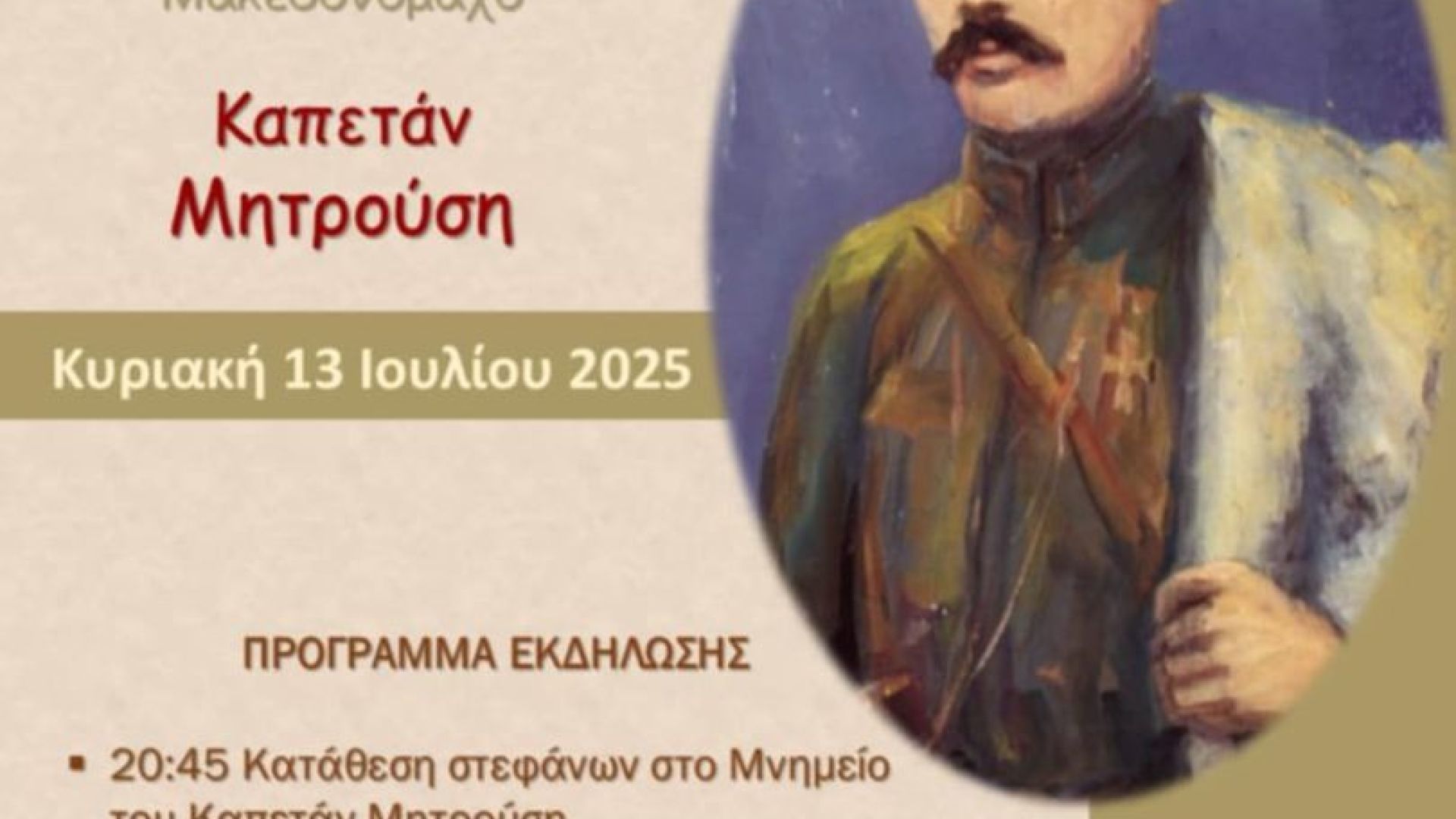 Εκδήλωση τιμής και μνήμης για τον Ήρωα Μακεδονομάχο Καπετάν Μητρούση, διοργανώνει την Κυριακή 13 Ιουλίου 2025, ο Λαογραφικός Όμιλος Κ. Μητρουσίου, σε συνεργασία με το Δήμο Σερρών και την Τοπική Κοινότητα Μητρουσίου, στον αύλειο χώρο του σχολείου.
