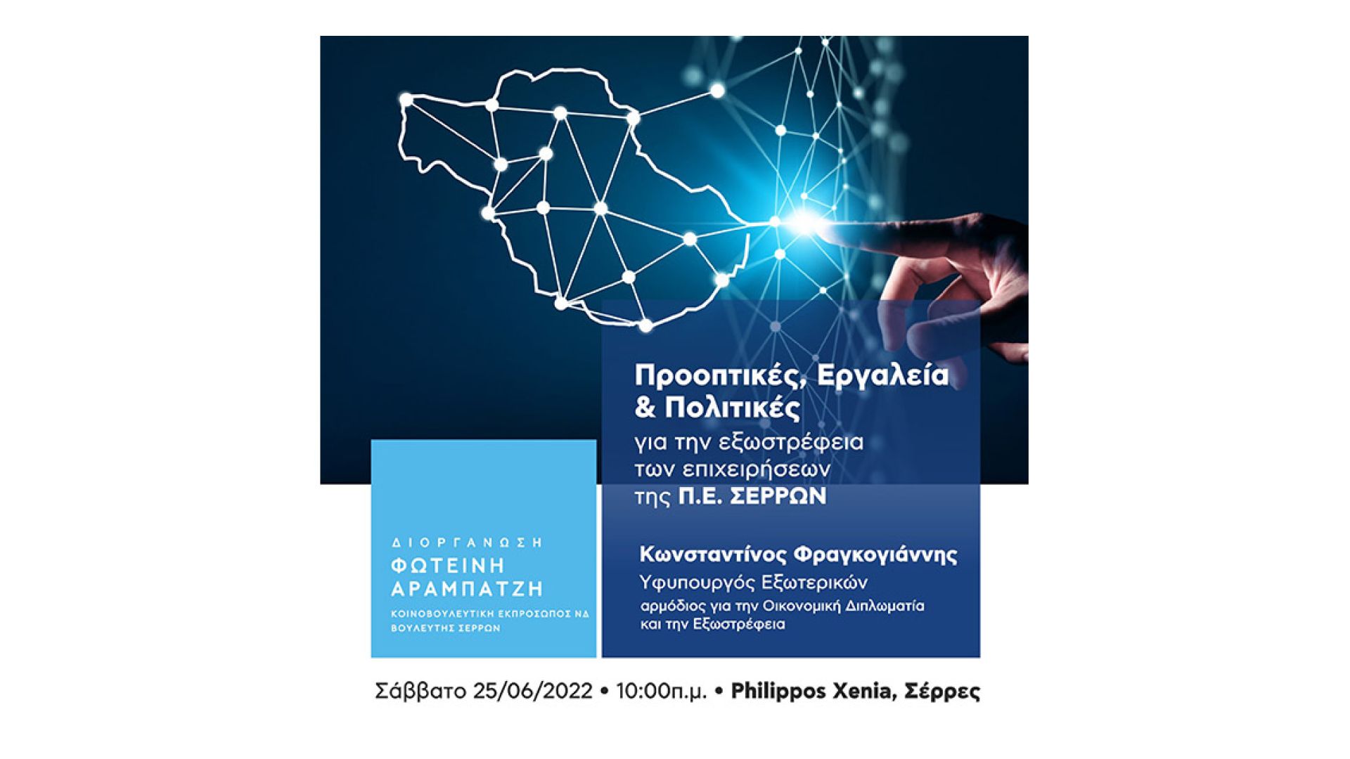 Εκδήλωση για την ενίσχυση της εξωστρέφειας των σερραϊκών επιχειρήσεων, διοργανώνει η Κοινοβουλευτική Εκπρόσωπος της ΝΔ και Βουλευτής Σερρών κ. Φωτεινή Αραμπατζή, το Σάββατο, 25 Ιουνίου, στις 10:00 π.μ. στο Ξενοδοχείο PHILIPPOS XENIA, στις Σέρρες.