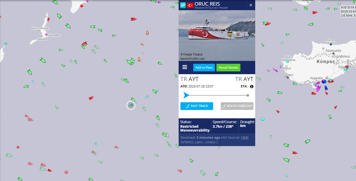 Σημειώνεται ότι ο πομπός του Oruc Reis, είχε κλείσει αργά χθες το βράδυ, στις 23:57 ώρα Ελλάδος και γύρω στις 2:00 τα ξημερώματα έδωσε ξανά στίγμα.