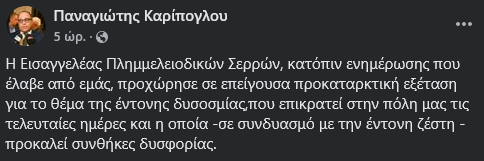 Επείγουσα προκαταρκτική εξέταση για το θέμα της έντονης δυσοσμίας στην πόλη των Σερρών διέταξε η Εισαγγελέας Πλημμελειοδικών Σερρών ύστερα από ενημέρωση που δέχτηκε από τον πρόεδρο του Δικηγορικού Συλλόγου Σερρών Π. Καρίπογλου, σύμφωνα με ανάρτησή του σε δημοφιλή πλατφόρμα κοινωνικής δικτύωσης.