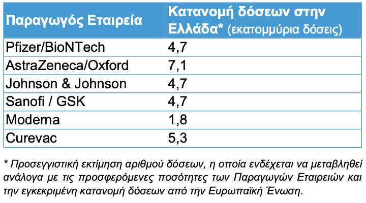 Η χώρα μας θα προμηθευτεί εμβόλια σταδιακά από έξι (6) τουλάχιστον παραγωγούς, ξεκινώντας με την πρώτη παραλαβή το Δεκέμβριο 2020 από την Pfizer/ BioNTech.