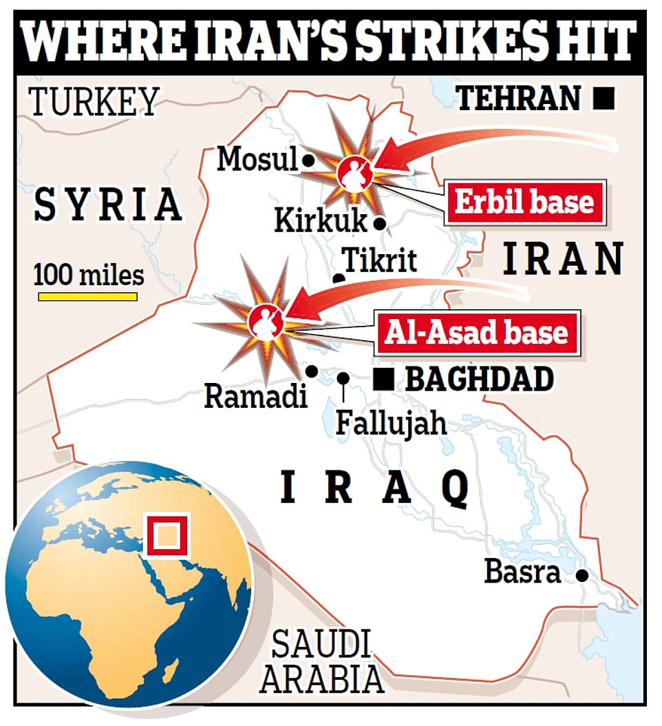 Όπως επιβεβαίωσαν Αμερικανοί αξιωματούχοι στο Γαλλικό Πρακτορείο και το Reuters, οι Ιρανοί εξαπέλυσαν δύο επιθέσεις κατά Αμερικανικών στρατευμάτων σε Αϊν Αλ Ασάντ και Ιρμπίλ, χωρίς να έχει γίνει ξεκάθαρο ακόμη αν υπάρχουν τραυματίες ή θύματα.