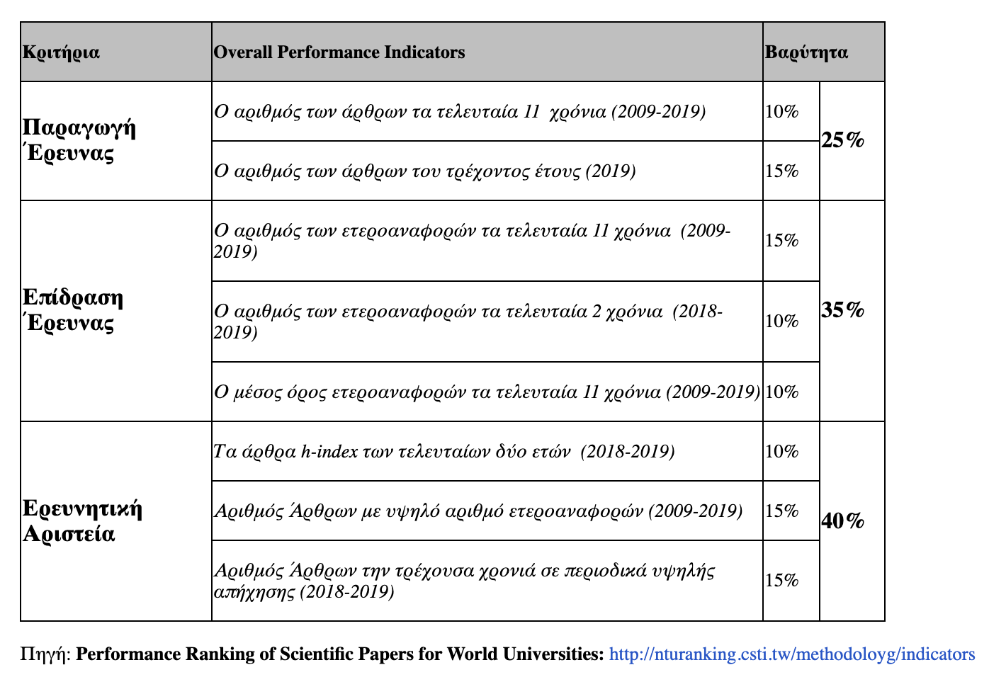 Κριτήρια Κατάταξης του Πίνακα «Performance Ranking of Scientific Papers for World Universities» για το 2020