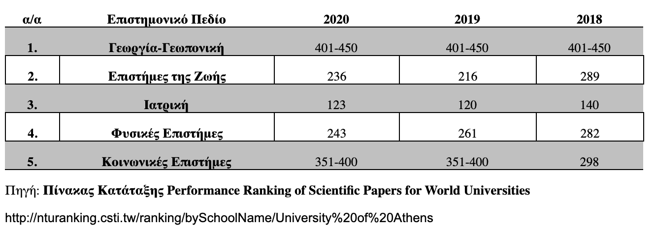 Σε σχέση με το 2019 το ΕΚΠΑ ανέβηκε έξι (6) θέσεις, καταλαμβάνοντας την 1η Θέση μεταξύ των έξι (6) Ελληνικών Πανεπιστημίων που συμπεριλαμβάνονται στον συγκεκριμένο πίνακα κατάταξης (Βλ. Πίνακα 2).  Επιπροσθέτως στην κατάταξη των Πανεπιστημίων  σε επιμέρους επιστημονικούς τομείς το ΕΚΠΑ βρίσκεται μεταξύ των άλλων, στην 123η θέση στον κόσμο στην Ιατρική (βλ. Πίνακα 3). Στην κατάταξη των επιμέρους επιστημονικών αντικειμένων το ΕΚΠΑ βρίσκεται στο top 100  στην Ανοσολογία και στην Φαρμακευτική – Τοξικολογία, στο  top 150 στην Κλινική Ιατρική και τη Φυσική, και στο top 200 στην Επιστήμη του Διαστήματος (βλ. Πίνακα 4).