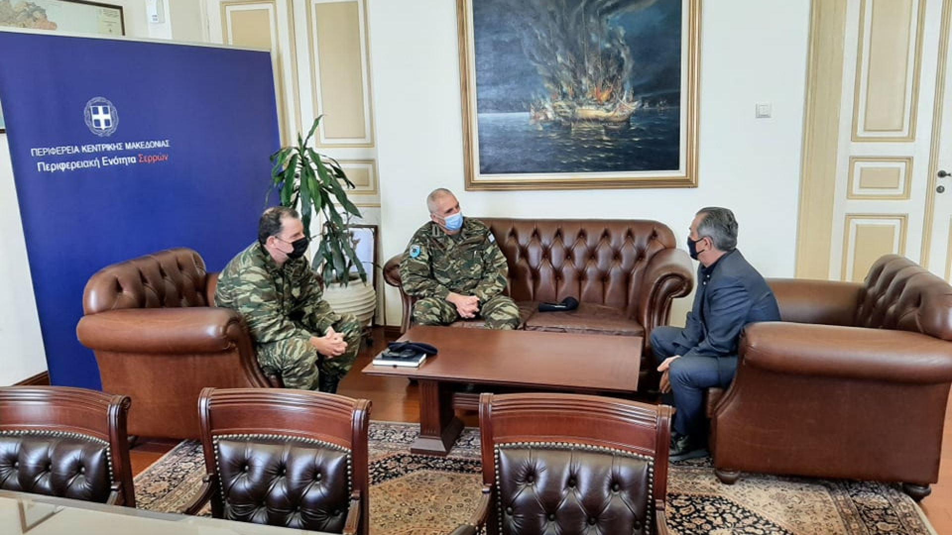 Κατά την συνάντησή τους, αφού αντάλλαξαν ευχές εν όψει του Πάσχα, ο Αντιπεριφερειάρχης αναφέρθηκε σε πάγιο αίτημα της τοπικής κοινωνίας για την αναβάθμιση των στρατιωτικών δομών της Π.Ε. Σερρών σε επίπεδο Ταξιαρχίας. Ο Αντιστράτηγος κ. Σπανός δήλωσε ότι θα καταβάλει κάθε δυνατή προσπάθεια για την ευόδωση του συγκεκριμένου αιτήματος.